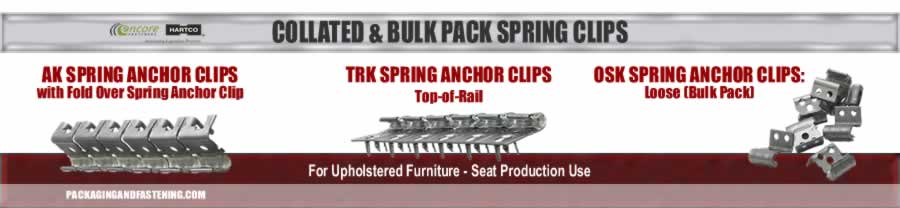 Encore Hartco AK Series, TRK series and OSK series spring anchor clips are available at packagingandfastening.com online. Get collated and bulk pack loose spring anchor clips for upholstered furniture or seating. Read more.